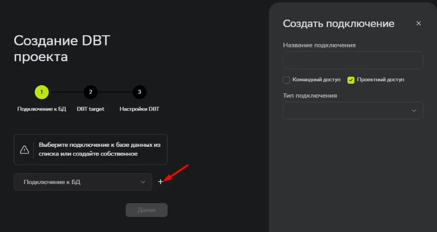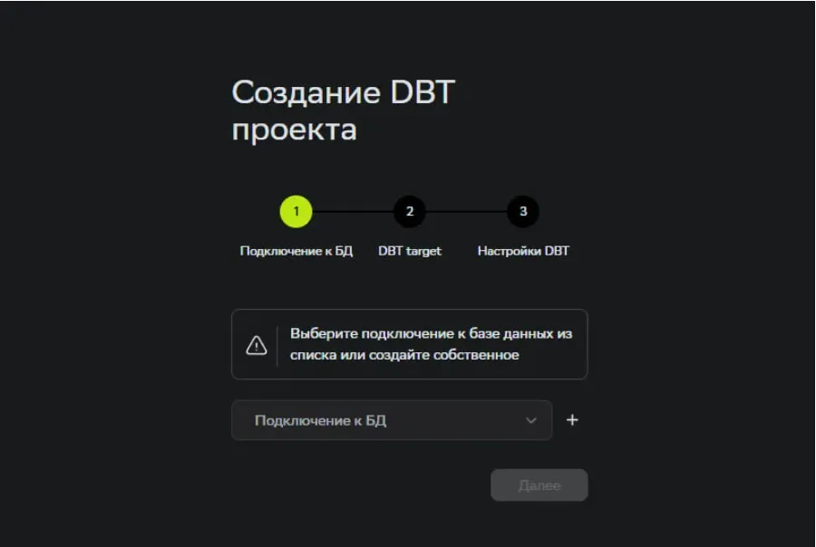 При создании проекта dbt необходимо настроить подключение к базе данных. Это нужно для выполнения моделей, запросов и работы с данными.