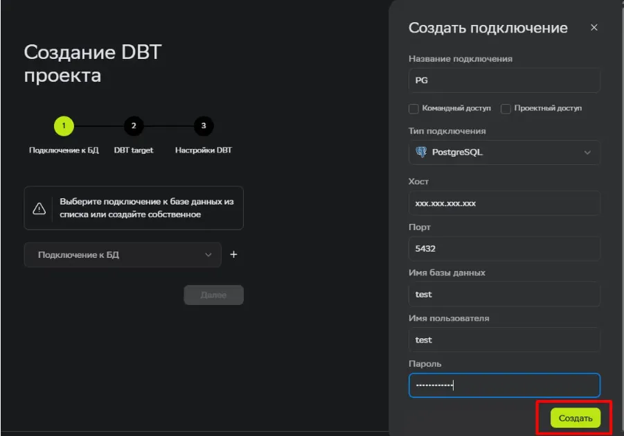 prod_postgres). - Выбрать доступ Определяет, кто может использовать подключение. Командный доступ: доступно всей команде, проектный доступ: только в рамках проекта.
